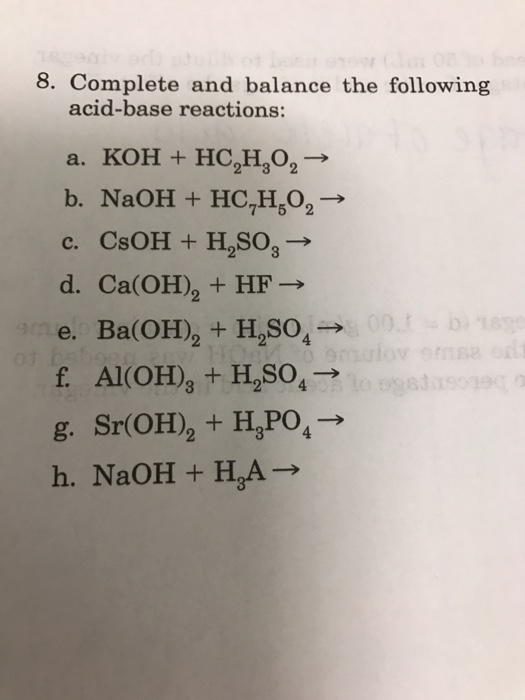 Complete and balance the equations for the following acid-base reactions. I also know that one of the products in an acid-base rxn must be H2O. For acids and bases that transfer 1 equiv of.
